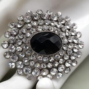 Description: This is a beautiful vintage Monet rhinestone brooch with a black oval faceted center which is surrounded by clear pave rhinestones in an oval shape. The rhodium plated backing is stamped MONET. This would be a great addition to your jewelry collection or make a great gift!