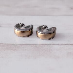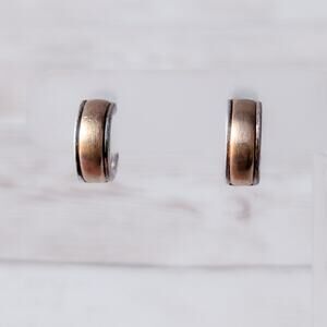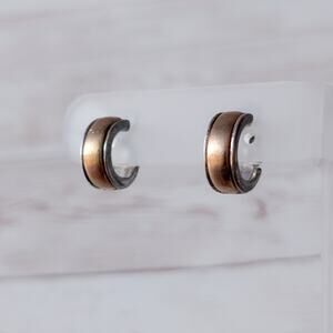 These earrings measure about 5/8". Looks like these have been painted at some point as the silver tone are is dark and looks not original. Center part tarnished. Tarnish and discoloration elsewhere. Marks and signs of wear.