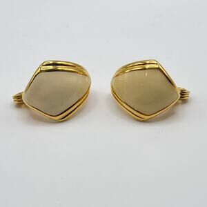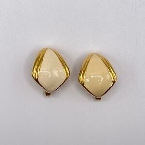 Vintage Monet Clip On Earrings Gold Tone Ivory White Enamel Diamond Shape