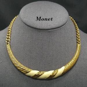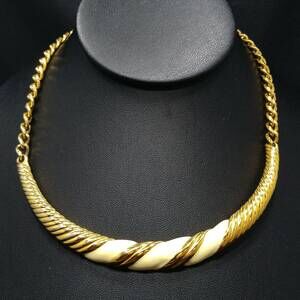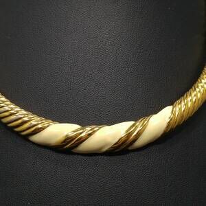 This elegant vintage Monet choker necklace from the 1960s features a striking combination of creamy enamel and bright gold plating in a twisted rope-inspired design. The front section blends smooth enamel with textured gold for a bold mid-century modern look.