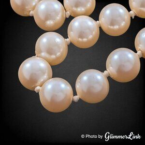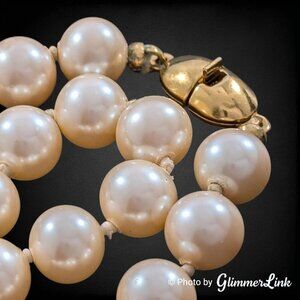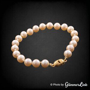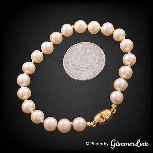 Vintage gold tone bracelet featuring a single strand of knotted creamy white faux pearls.