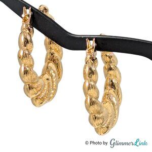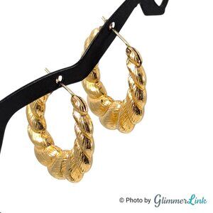 Classic vintage Monet hoop earrings featuring a bold croissant shrimp design with textured gold tone finish. These pierced earrings are lightweight and hollow, offering a substantial look without heaviness.