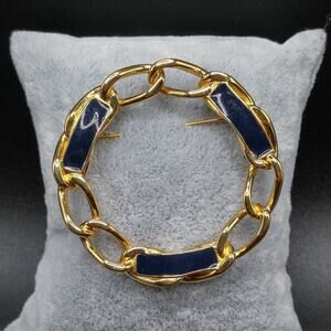 Vintage Monet Dark Blue Enamel Round Chain Brooch, Gold Plated, 2 Inches