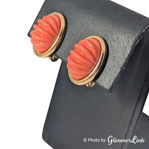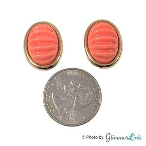Vintage Monet Dome Oval Coral Pink Ribbed Gold Tone Clip On Earrings