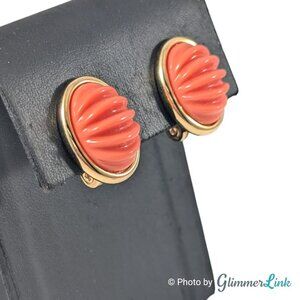 Vintage gold tone clip on earrings featuring an oval shape with coral pink ribbed Lucite dome ovals.