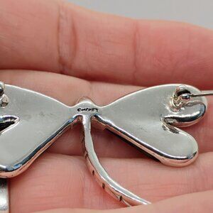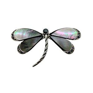 This exquisite vintage Monet dragonfly brooch features a silver tone with abalone, marcasite, and rhinestone accents. Perfect for adding a touch of elegance to any outfit or collection.