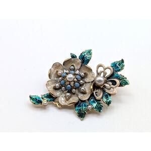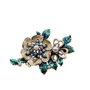 Vintage Monet Faux Pearl Enamel Floral Leaf Gold Tone Brooch