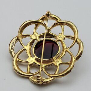Vintage Monet Flower Brooch Gold Tone Clear And Red Rhinestone 45 mm Signed
