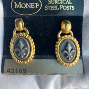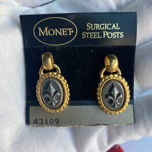 Vintage Monet Gold Tone Fleur De Lis Dangle Earrings 90s Regencycore Feminine