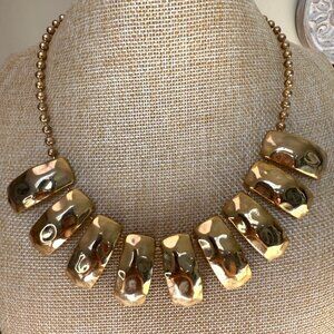 A bold vintage-inspired necklace with a rich gold tone and hammered chunky pendants. Perfect for making a striking statement.