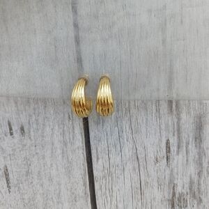 Vintage Monet Gold Tone Stud Hoop Earrings, Stripe Texture Design, Signed