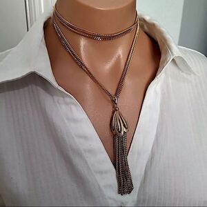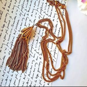 This vintage Monet necklace is a stunning piece featuring a gold-tone finish with a length of 28 inches, giving it a bold, elegant look. The design centers around a tassel pendant made of multiple strands of fine chain, flowing gracefully from a decorative cap that showcases intricate cut-out details. The necklace chain itself is substantial, with a smooth and polished texture that adds to its luxurious appearance. In excellent condition, this piece reflects classic Monet craftsmanship, perfect for adding a touch of vintage sophistication to any outfit.