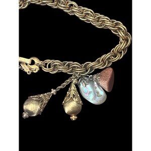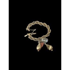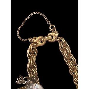 This vintage-inspired charm bracelet showcases intricate gold-plated links paired with dangling textured charms, including a luminous pearl and ornate accents. A timeless accessory blending elegance and artistry, it exudes sophistication for collectors or jewelry enthusiasts. The craftsmanship reflects an era of detailed beauty, making it a cherished addition to curated collections.