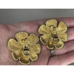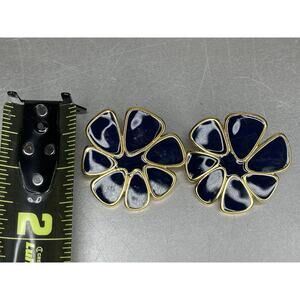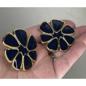 Vintage Monet Navy Blue Enamel Gold Tone Metal Clip On Statement Flower Earrings