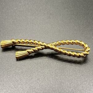Vintage Monet Rope With Tassel Brooch Pin Bow Ribbon Gold Tone