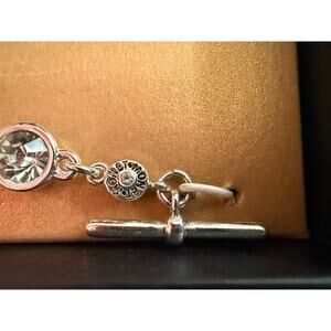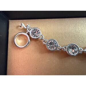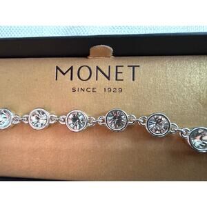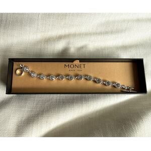 Elegant Monet bracelet featuring round clear crystal stones set in silver-tone bezels. Classic linked design with toggle clasp. Stamped Monet on the clasp. Comes with the original Monet box, making it a wonderful gift or collector’s piece.