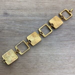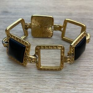 Vintage black and gold square charm book chain Bracelet by Monet Jewelry. The bracelet features 6 links with large square black cabachons accented by Cut out gold frames with dotted milgrain like detailing. Light signs of pre ownership, overall excellent condition. A glamorous accessory, collectible costume jewelry. Signed