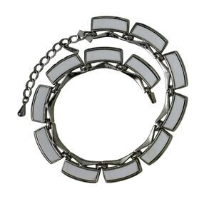 Vintage Monet Thermoset White Plastic Rectangular Links Set in Silver Tone Settings Adjustable Hook Closure. Twelve links. Logo on small silver tag is attached to the chain link. Weighted with a rounded cone shaped charm.