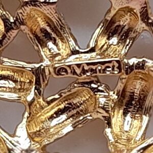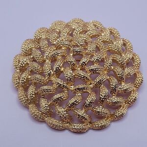 This brooch is a vintage Monet gold-tone brooch, likely from the 1950s. It features a textured, circular design resembling a woven or braided rope. The brooch has a bar-pin fastening on the back. These brooches are often described as having a 22kt gold-plated finish. This would be a great addition to your jewelry collection or make a great gift!