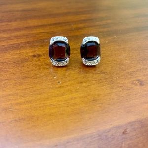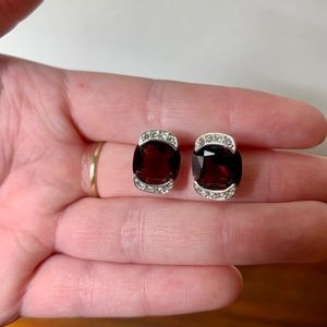 A beautiful pair of vintage Monet stud earrings that feature a faux garnet deep red / maroon stone with diamond cz stones surrounding. Lovely earrings that look like the real thing for any vintage earring lover!