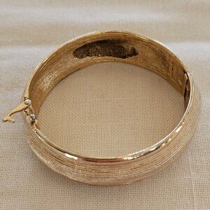 This Vintage Monet (about 1970's), gold-toned metal bangle bracelet with a textured, ribbed-cut design is a stylish piece of jewelry perfect for any occasion. The bracelet is stamped Monet, a reputable brand known for its quality and classic designs. The retro style and fashion-forward aesthetic make it a unique and timeless accessory for women who appreciate vintage pieces. Made of metal, this bracelet measures approximately 2.5" across (about 6.2" inside diameter), and 5/8" W, and has a safety lock. It is in excellent used condition on the outside, but has a discolored section on the inside that can't be seen when worn. A beautiful bangle, both trendy and elegant.