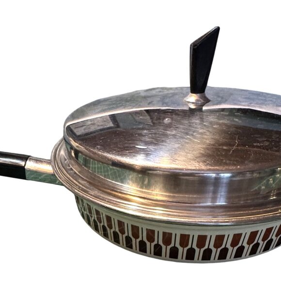 This frying pan is so retro it'll make your eggs feel like they’re on a 70s sitcom. Non-stick vibes with a tough lid for culinary drama.
