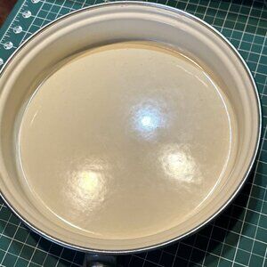 Light scratches on lid and handle consistent with vintage use. Top to bottom = 3 inches, diameter = 8 inches.