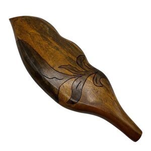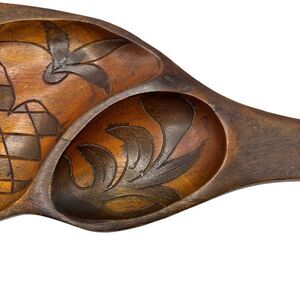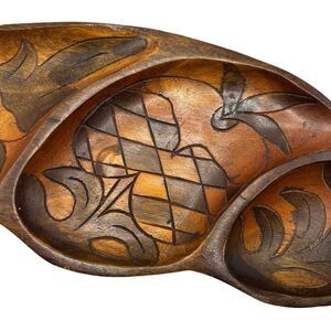 Beautiful vintage serving dish hand-carved from genuine monkey pod wood. Designed in a graceful leaf shape with three compartments and intricate tropical carvings, including a pineapple motif. Perfect for a mid-century tiki bar, boho kitchen, or coastal décor. Great for serving snacks, nuts, candies, or as a unique decorative accent.