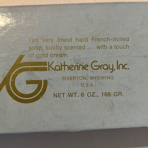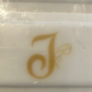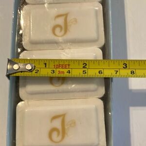 Set of four white soaps with gold monogram of the letter “J”. Perfect for gifting or personal use. Katherine Gray Inc., out of Riverton, Wyoming, is vintage and collectible. The design lasts as long as the soap.