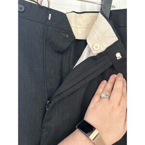 Excellent condition. Vintage, classic style with light pleating at the waist and cuffed at the bottom. Charcoal grey. Trouser style latch closure and back pockets.