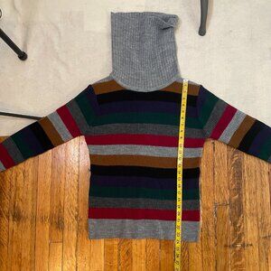 This long vintage striped sweater has a fun loose turtleneck that lays more like a cowl neck. Great vintage condition. Made by Montage; 100% acrylic with good amount of stretch. Fantastic over skinny jeans, leather leggings or pants or a skirt! A great vintage piece to incorporate into your modern closet to create a one-of-a-kind look. Fits small/medium. See photos for details and flat sizing.