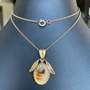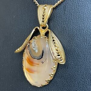 Vintage Montana Agate Pendant Necklace Gold Tone Filigree OOAK Unusual 24”L