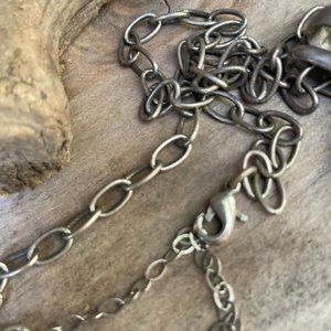 Heralding from the coveted line of MT Silversmith Southwest Jewelry line is this striking necklace with a round polished cabochon stone in a turquoise color, emulating the Kingman Turquoise with a deep espresso matrix. Stone is inlaid in a round Southwest Style Concho setting in Silverplate with dramatic oxidization. Measurement of the medallion is 1-3/4". Link chain measures 18" end to end with a 3" fine chain extender. Finding is a lobster claw. The bale is a decorative triple. Nice vintage condition with minor patina consistent of a pre-owned piece of its nature and time.
