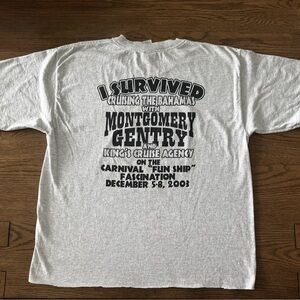 Travel in style with this rare 2003 Montgomery Gentry cruise T-shirt! Featuring boldly printed black-and-white imagery of Eddie Montgomery and Troy Gentry plus playful retro text—this soft, heavyweight Gildan shirt is a nostalgic keepsake from a one-of-a-kind fan experience aboard the Carnival Fascination, December 5–8, 2003.