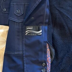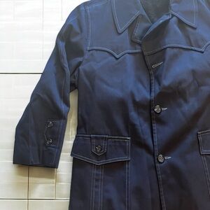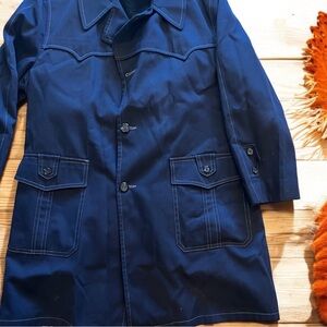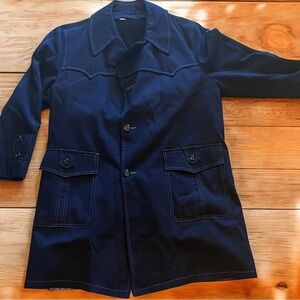 Vintage Montgomery Wards men’s car coat. Navy with white stitching and fleece zipper lining. Western stitch flair on back. Fantastic orange design for lining. #mongomerywards #vintagemenswear #vintagecarcoat #carcoat #westerncarcoat