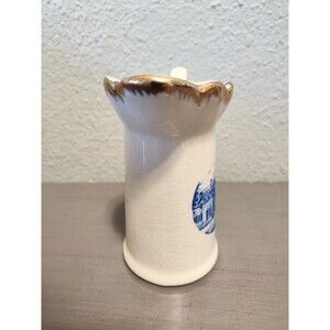 The Vintage Monticello Souvenir Pitcher is a charming collectible item that dates back to the 1960s. This small ceramic pitcher features a beautiful blue transferware design with gold trim, and a crackle glaze finish. With its unique style and vintage appeal, this pitcher would make a lovely addition to any kitchen or dining collection. At just 5 inches in width, this pitcher is compact and perfect for displaying or using as a functional piece in the home.