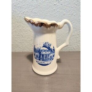 Vintage Monticello 5" Souvenir Pitcher Blue Transferware Gold Trim Crackle Glaze