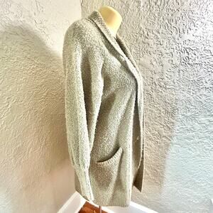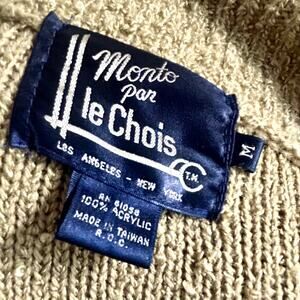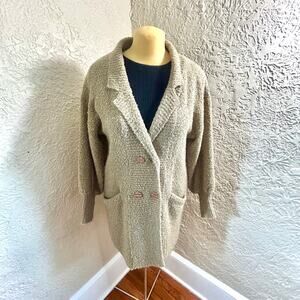 Vintage “Monto Par Le Chois” cardigan coat from the 1980s, featuring a cozy textured bouclé knit in a neutral tan shade. This medium-weight acrylic piece has a flattering longline silhouette, lapel collar, two front pockets, and double-breasted buttons. The puffed sleeves and ribbed cuffs give it a subtly tailored look that blends comfort and structure.
