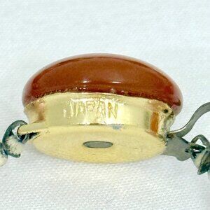 Vintage moonglow Lucite/thermoset amber tone oval beads alternating with pink pearlescent/iridescent beads topped with lacy gold tone bead caps. Round box clasp stamped "Japan" on the edge. Circa 1950s-60s. Good overall vintage condition. No major flaws or wear.