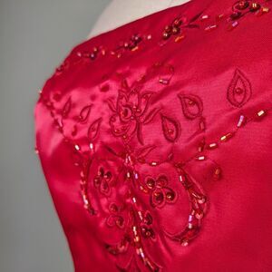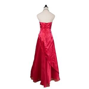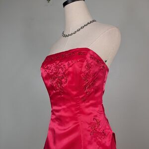 Vintage prom dress maxi ball gown from Morgan & Co, size 8. Pinkish red. Strapless with floral beading. Chiffon under layers. Ideal for fairy princess, Y2K, glam, classic, fairytale, romantic and vibes.