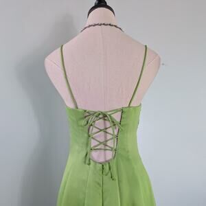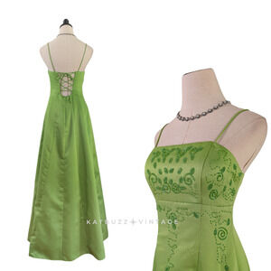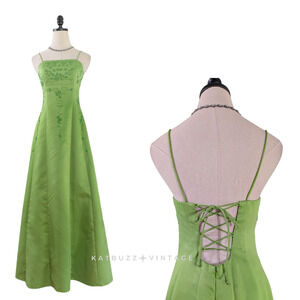 Vintage 90s Y2K Prom Dress Beaded Corset Maxi Gown by Morgan & Co - Size 10 - Apple Green