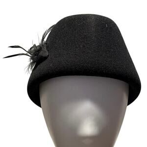 Elegant vintage wool hat by Morgan Taylor, made in Italy. Features a structured, asymmetrical shape with a rounded crown and a turned brim. Adorned with a chic feather and fabric embellishment on one side. Made of 100% wool with a soft interior band. WPL 8048 tag suggests it was produced before 1984. One size fits most. Measures 21.5” inside the rim. Preowned, near mint vintage condition.