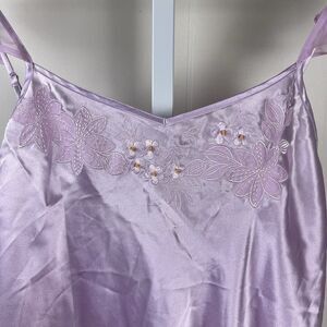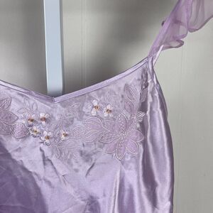 Vintage Morgan Taylor Intimates lilac purple satin slip dress with floral appliqués.