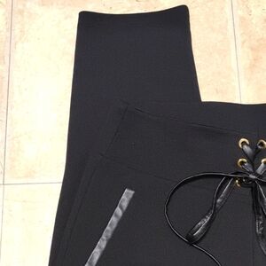 Chic black pants with lace-up front. Made in France. very well known co. tie up is made of faux leather with tassels on ends and gold grommets. has 2 faux front pockets with faux leather trim and 2 back faux pockets also trimmed in faux leather. they have a zipper up left side for easy wear. material poly and viscose with some elastane for stretch. very soft and stretches to your curves. dress them up in heels or boots. or wear casual. a perfect pair of imported pants.