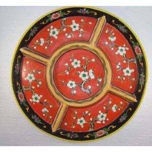 This lovely 3 section dish or relish tray has white and green floral designs on a orange background.
