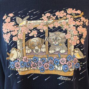 Good condition, vintage sweatshirt w/normal wash wear, lightly stretched neck, faint spot on lower hem, no rips, holes or tears, adorable kitty and dog watching rain through window, crew/mock neckline, graphic has a crackled appearance