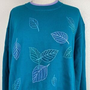 Vintage Morning Sun Womens Teal and Purple Leaf Pattern Sweater Size XL. It measures 26 inches armpit to armpit and 27 inches in length.