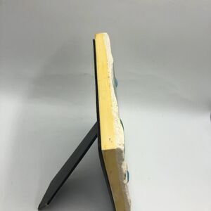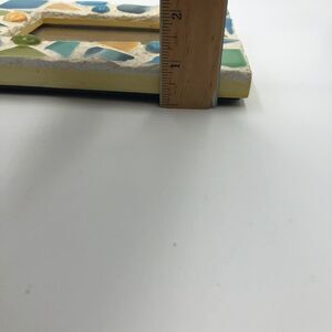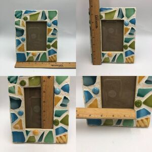 Vintage Mosaic Abstract Picture Frame Tabletop Shelf Décor. Frame is vintage (pre-2004) pre-owned. Please see all photos for visible condition. No original box. Heavy. Colors are blue gold green. Frame measures approximately 7.5 inches x 6 inches. Window area measures approximately 4.5 inches x 3 inches. No noticeable chips/cracks. Sticker residue on back stand with a minor dog ear on edge - see photo. Can't tell if this is real glass or a hard plastic but feels like glass. Actual age/brand unknown but previous owner had prior to 2004.