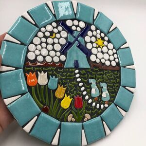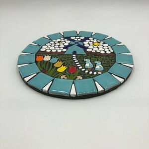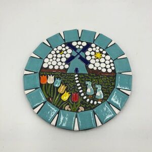 Vintage Mosaic Blue Ceramic Tile Art Trivet Round Windmill Country Farm House Charm Flower Tulips Hot Plate Holder. Trivet is vintage pre-owned. Please see all photos for visible condition. No original box. Actual brand unknown. Felt on bottom. Barely used if at all. Previous owner stated pre-2004. Approximately 7 inches in diameter. I have two blue ones and one brown one - this listing is only for one blue one. If you'd like others, please message.