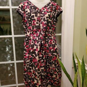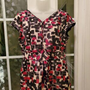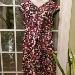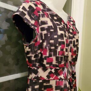 Vintage Moschino Abstract Geometric Paint Stroke Formal Cocktail Dress - Burgundy, black, and beige color. Paint stroke geometric pattern style. Like new condition, no flaws. Vintage made in Italy Moschino tag at the neckline. No other tags but there have been other Moschino items with this pattern listed before. No size tag but approx measurements below - fits like a medium women's. Gorgeous rare unique avante garde statement piece dress. Boxy fit, short sleeves. Lining around the chest for definition. Thick material. Pullover style. Plunging v-neckline. Zipper on the side in black. Midi length. Perfect for formal events or work attire, cocktail dress style. Two side pockets.